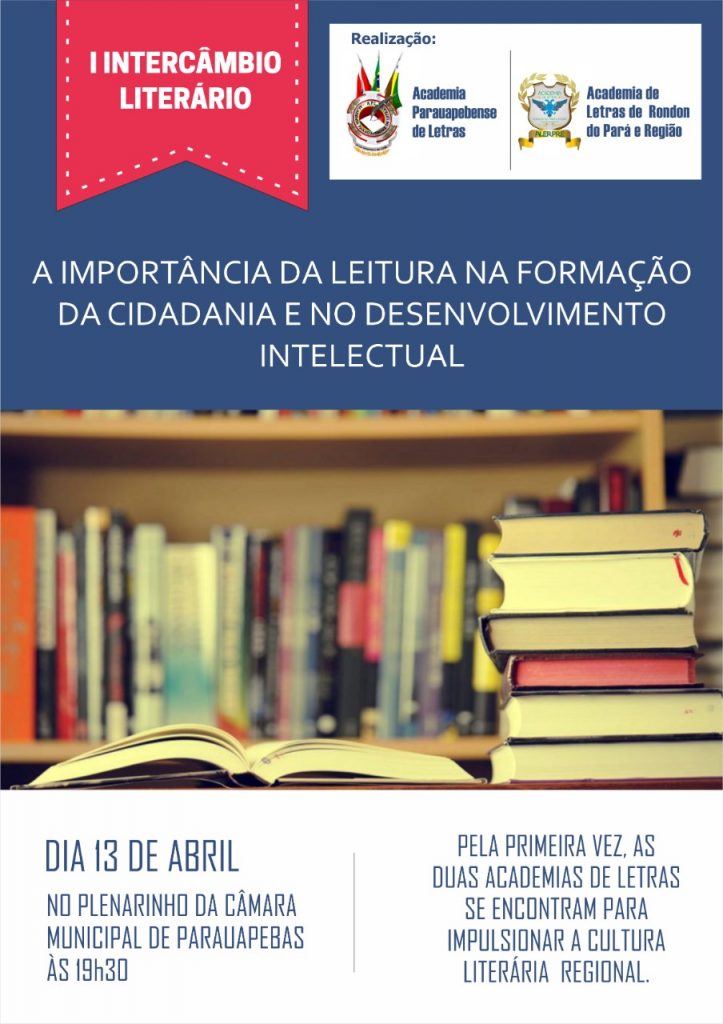 A Academia Parauapebense de Letras e a Academia de Letras de Rondon do Pará e Região realizam neste sábado (13), no Auditório Plenarinho da Câmara Municipal de Parauapebas, a partir das 19h30, o I Intercâmbio Literário.