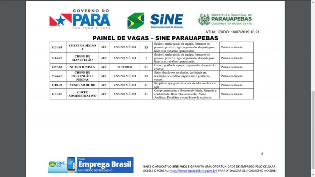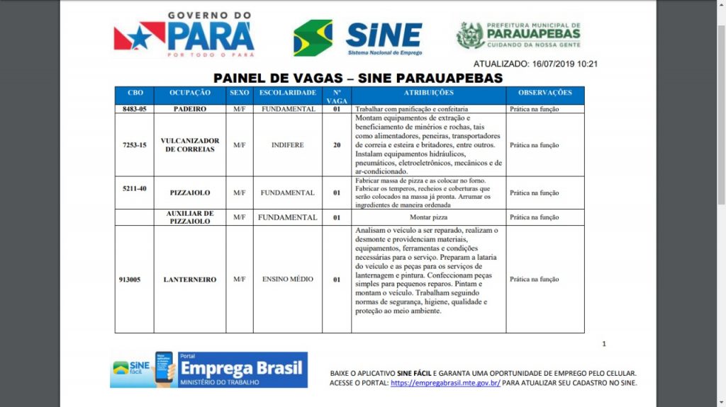 A Prefeitura de Parauapebas informa vagas de emprego abertas hoje, 16. O Sine fica na rua 11, entre as ruas E e D, no bairro Cidade Nova. O horário de atendimento é de 8h00 às 14h00.
