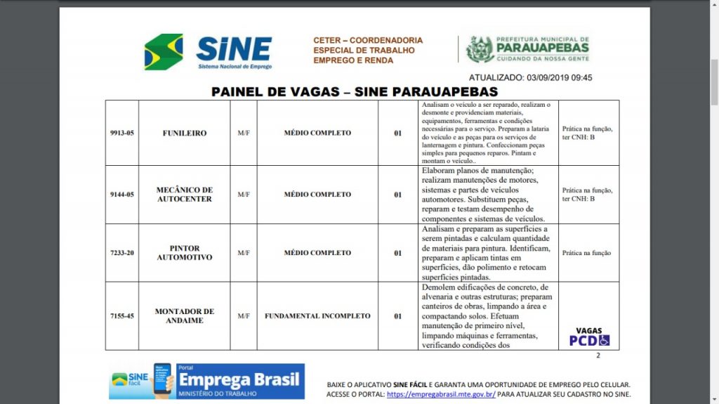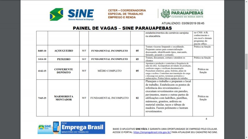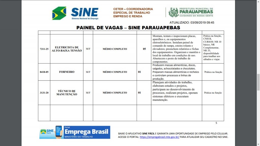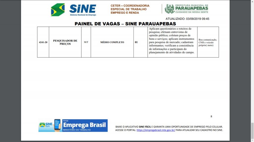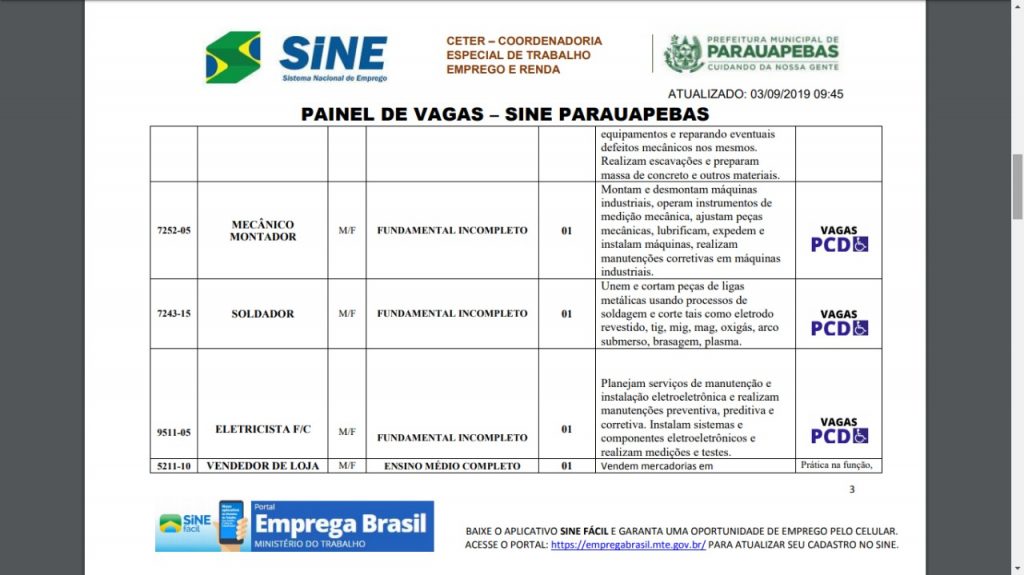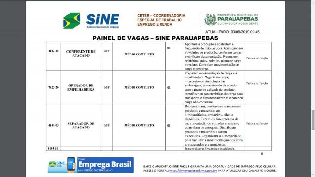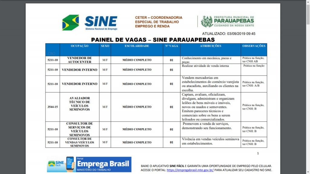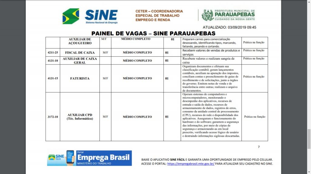 A Prefeitura de Parauapebas informa vagas de emprego para hoje, 03. O Sine fica na rua 11, entre as ruas E e D – Cidade Nova. O horário de atendimento é de 8h às 14h.