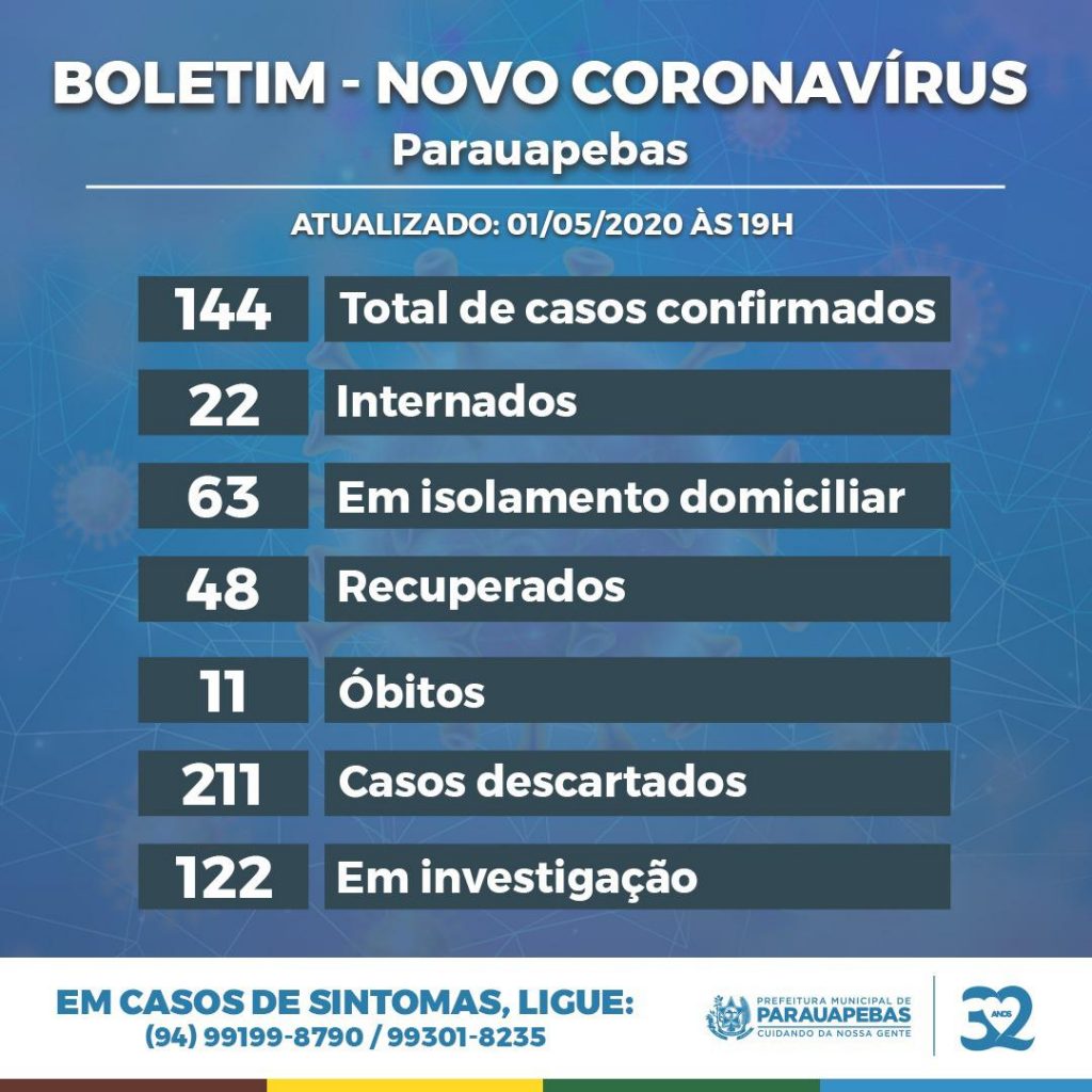 De acordo com Boletim Epidemiológico divulgado no início da noite desta sexta-feira (1) pela Secretaria Municipal de Saúde de Parauapebas (Semsa), mais 11 casos de Covid-19 foram confirmados. Entre eles, um óbito de um paciente que faleceu com suspeita da doença.