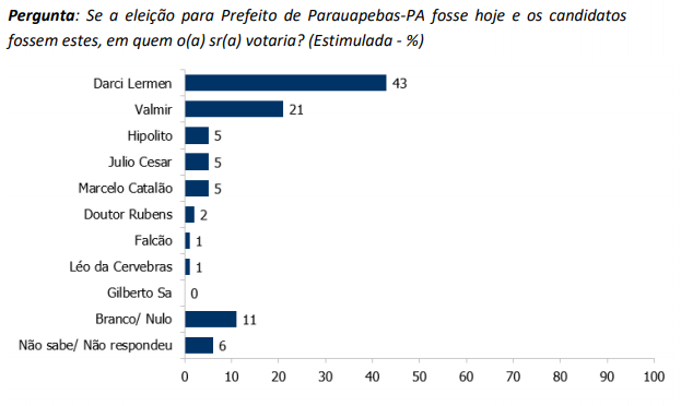As intenções de voto no atual prefeito de Parauapebas, Darci Lermen (MDB), se acentuam conforme aumenta a renda familiar dos entrevistados. Assim, o candidato alcança 49% entre os eleitores com renda familiar maior que 2 salários mínimos e atinge 37% entre aqueles com renda familiar de até 1 salário mínimo.