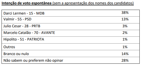 Os dados foram coletados em pesquisa de intenção de votos feita pelo Ibope Inteligência, entre os dias 29 de setembro e 1 de outubro. A pesquisa que foi registrada na Justiça Eleitoral vem mostrando que o atual prefeito Darci Lermen (MDB) aparece na liderança com vantagem, mencionado por 43% dos eleitores. Enquanto que o ex-prefeito Valmir Mariano (PSD) obtém 21% das intenções de voto.