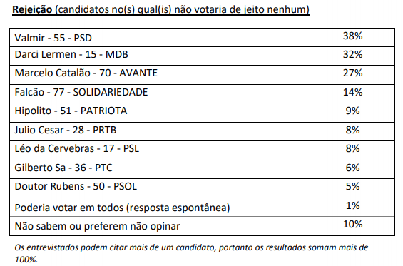 O mesmo ocorre com o ex-prefeito Valmir Mariano (PSD), que obtém 28% entre os eleitores com renda familiar maior que 2 salários mínimos, contra 15% entre aqueles com renda familiar de até 1 salário mínimo.