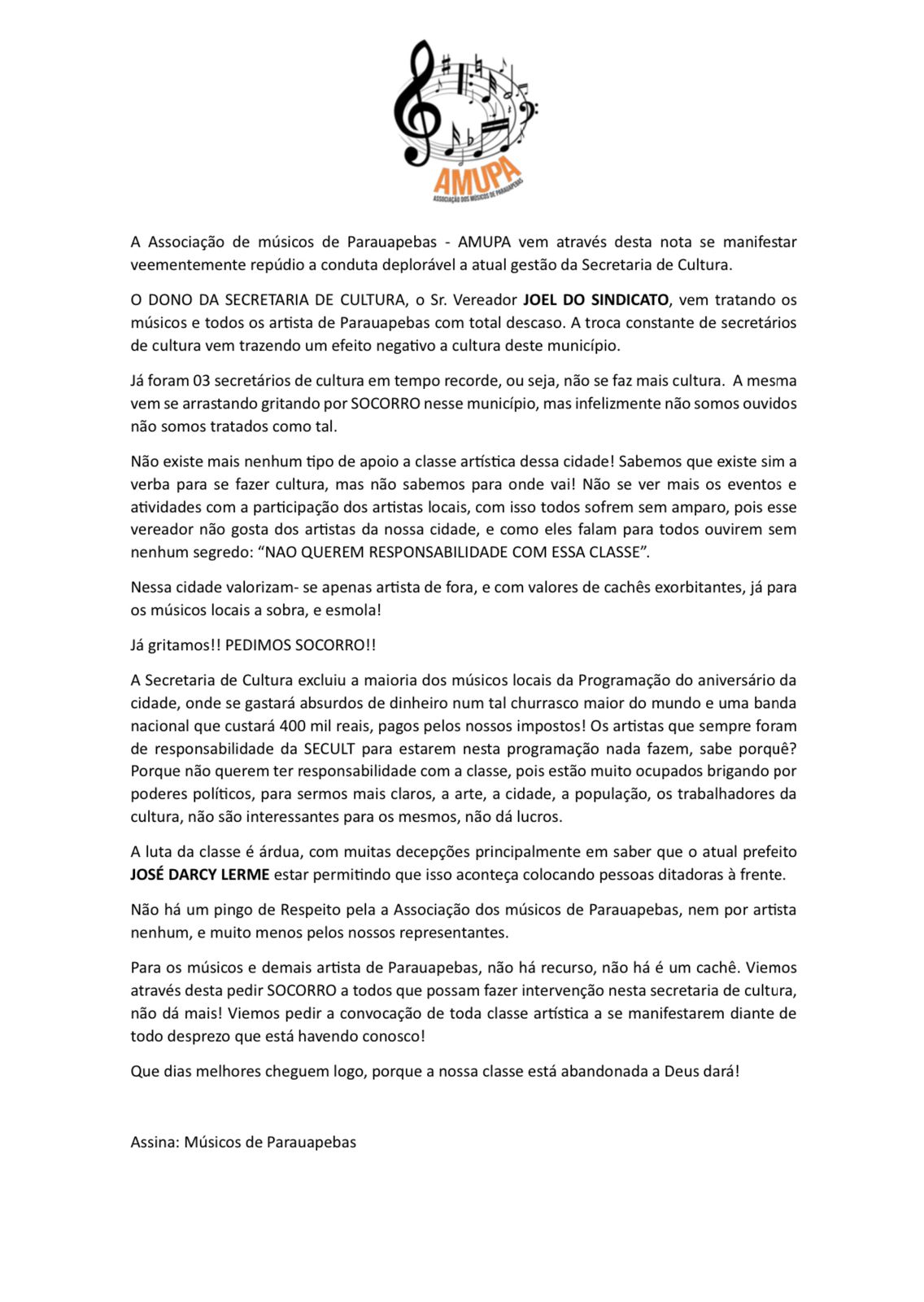 Em um trecho da nota, os músicos afirmam que “o dono da Secretaria de Cultura, o Sr. Joel do Sindicato, vem tratando os músicos e todos os artistas de Parauapebas com total descaso”.