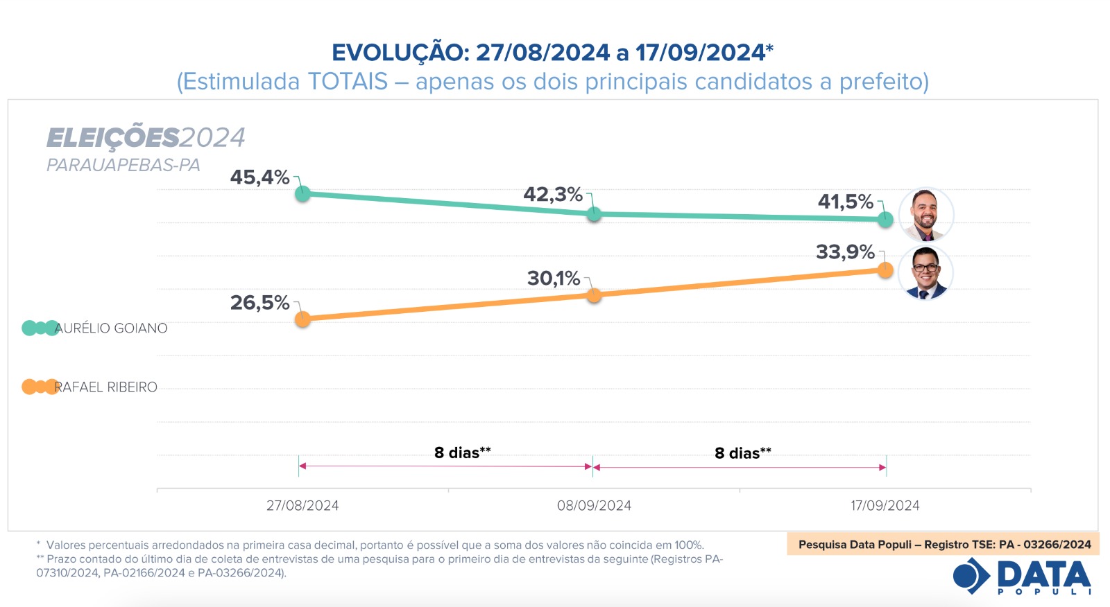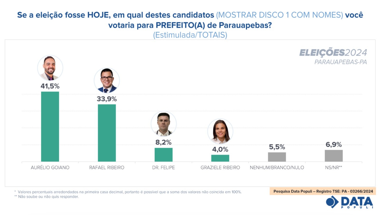A mais recente pesquisa eleitoral sobre as intenções de votos para prefeito em Parauapebas, da empresa Intelidata Pesquisas Inteligentes, registrada no TSE sob o número PA 02884/2024, tendo como responsável técnico Rogério da Silva Santos, nº CONRE 9423, realizada entre 16 e 19 de setembro, confirma a tendência mostrada por outras pesquisas também registradas no TSE, com vitória do candidato a prefeito Aurélio Goiano (Avante) no primeiro turno.