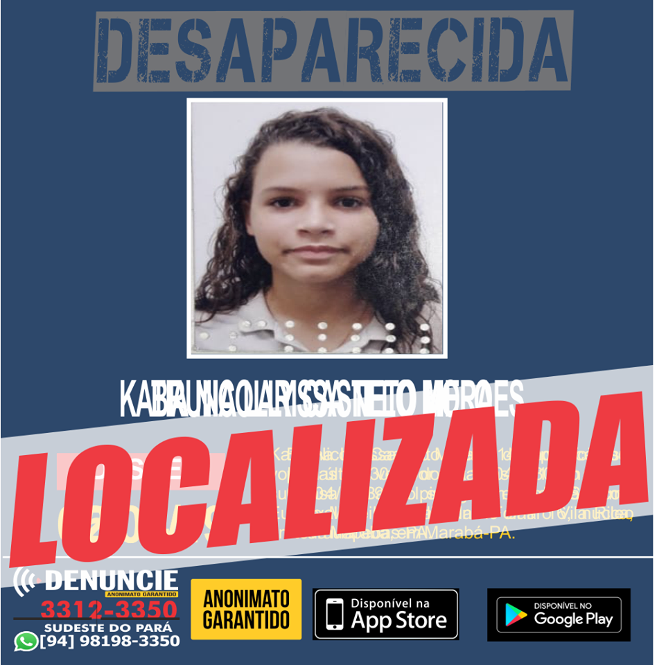 “O Disque Denúncia Sudeste do Pará agradece a todos que compartilharam o cartaz de desaparecida de Katia Nicolly Castelo Moraes e informa que ela já foi localizada”.