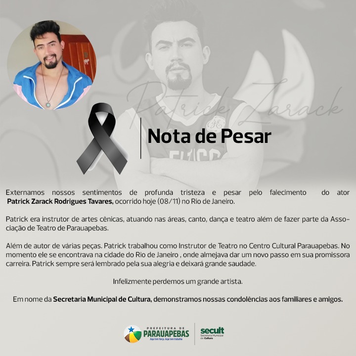 É com imensa tristeza e dor que a equipe de reportagens do Portal Pebinha de Açúcar tem a triste missão de informar sobre a morte do ator Patrick Zarack Rodrigues Tavares, que foi bastante atuante na cultura de Parauapebas, porém, ultimamente estava morando no Rio de Janeiro, com o objetivo de alavancar ainda mais sua carreira.