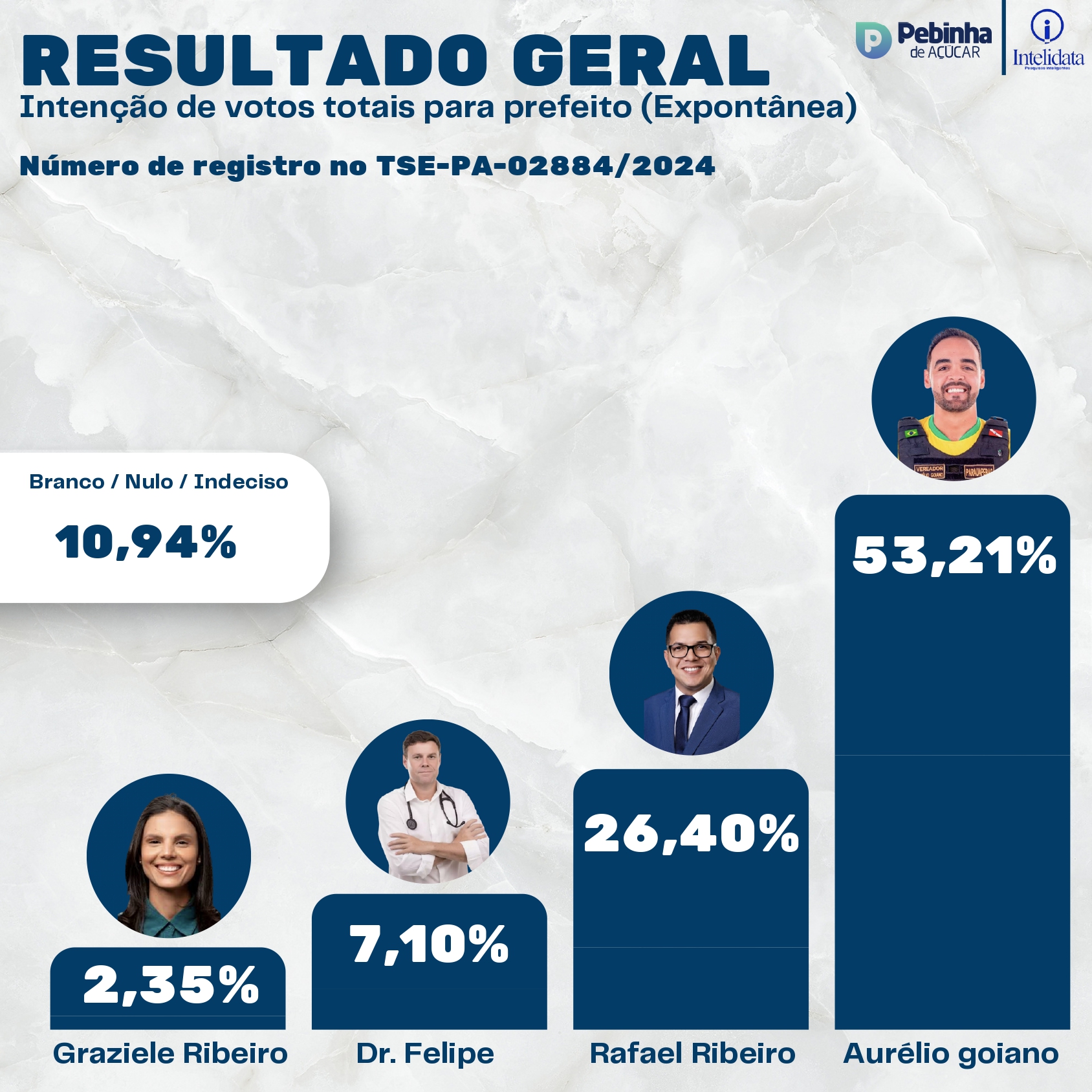 Na pergunta espontânea, onde o eleitor responde sem ver as opções, os números mostram que Aurélio Goiano (Avante) consolida a vitória em 1º turno dia 6 de outubro, com 53,21%, seguido de Rafael Ribeiro (União Brasil), com 26,40% dos votos. Em terceiro lugar, Dr. Felipe (PL), com 7,10%, seguido por Graziele Ribeiro (PSD), com 2,35%. Votos brancos, nulos e indecisos somam 10,94%.