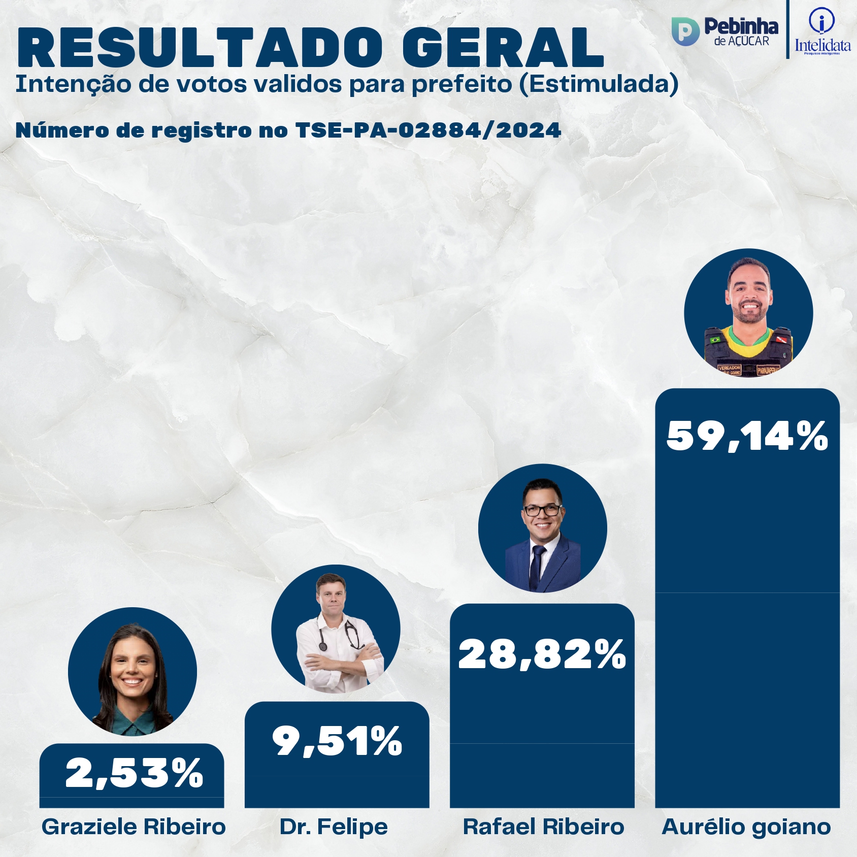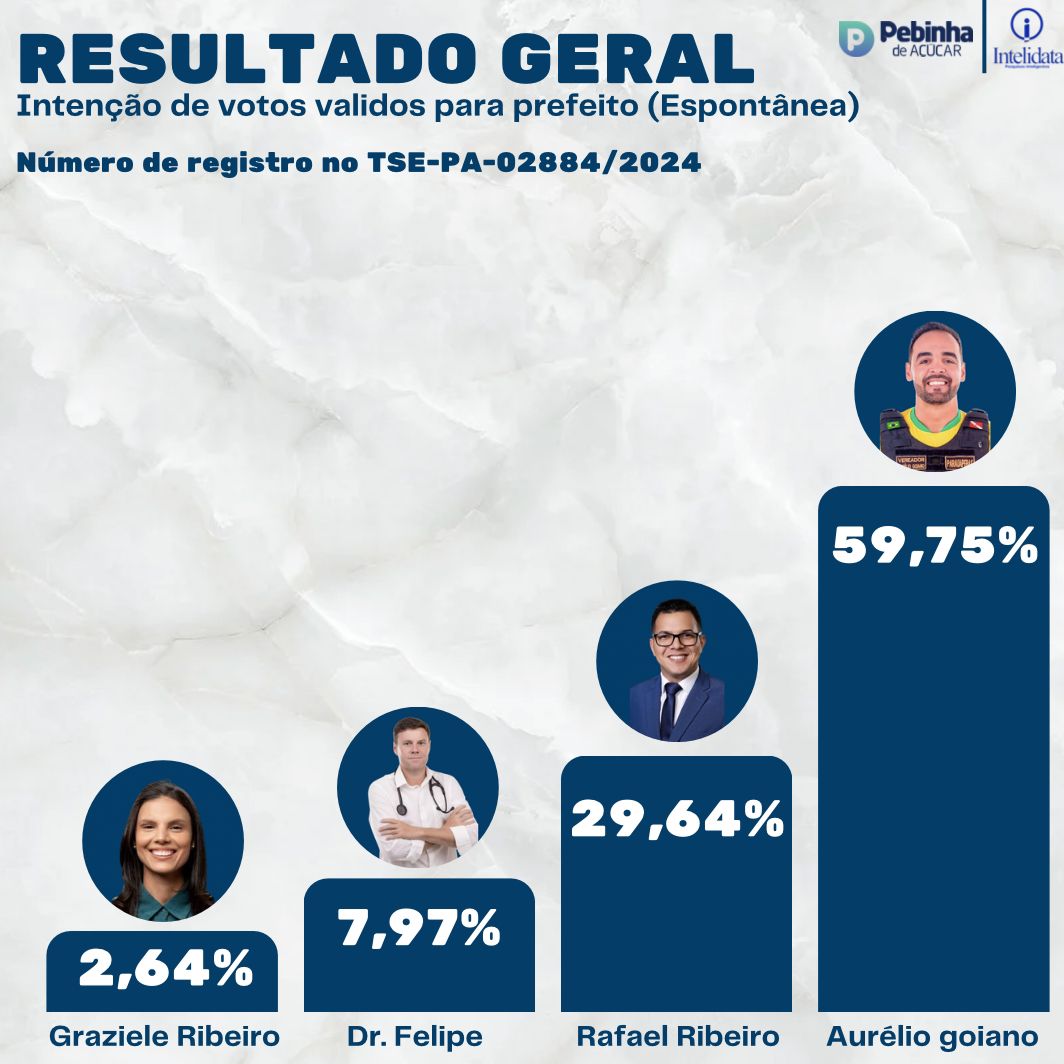 A mais recente pesquisa eleitoral sobre as intenções de votos para prefeito em Parauapebas, da empresa Intelidata Pesquisas Inteligentes, registrada no TSE sob o número PA 02884/2024, tendo como responsável técnico Rogério da Silva Santos, nº CONRE 9423, realizada entre 16 e 19 de setembro, confirma a tendência mostrada por outras pesquisas também registradas no TSE, com vitória do candidato a prefeito Aurélio Goiano (Avante) no primeiro turno.