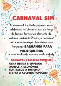Por sua vez, durante a manhã desta quinta-feira (24), comandados pela Liga das Agremiações dos Blocos e Escolas de Samba de Parauapebas (Liabesp), várias agremiações carnavalescas iniciaram a campanha “Carnaval Sim”, chamando a atenção do Governo de Parauapebas sobre a importância da realização do evento na cidade.