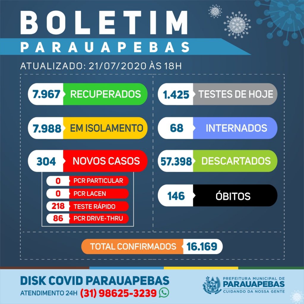 Evite aglomerações! De acordo com dados do Boletim Epidemiológico da Secretaria Municipal de Saúde de Parauapebas (Semsa), hoje, 21 de julho foram confirmados 304 novos casos de Covid-19. A Prefeitura continua adotando medidas preventivas e conta com o apoio da população para juntos combatermos o coronavírus.