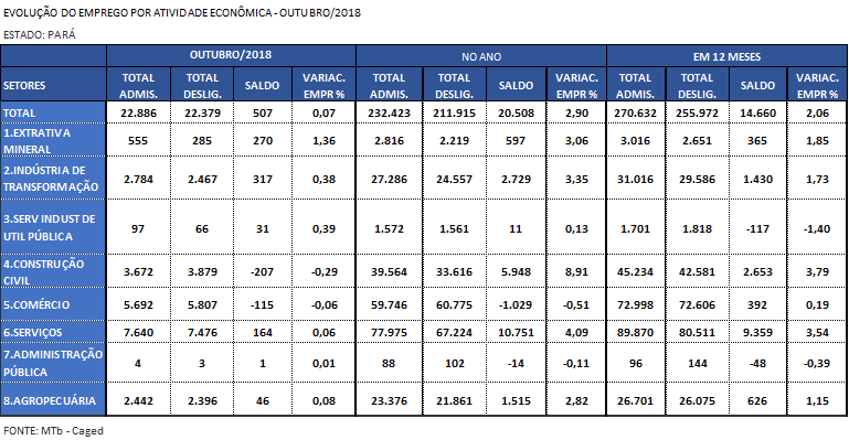 O Pará terminou o mês de outubro com saldo positivo de 507 empregos formais, aponta o Cadastro Geral de Empregados e Desempregados (Caged), divulgado pelo Ministério do Trabalho na quarta-feira (21). O número representa crescimento de 0,07%, em relação a setembro. Foram 22.886 admissões e 22.379 desligamentos durante o período.