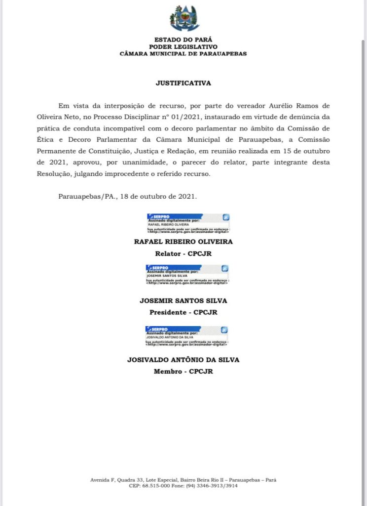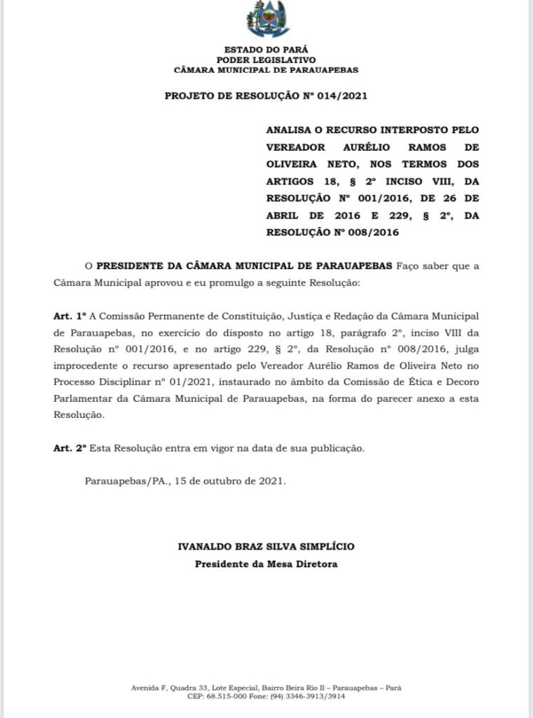 “Em vista da interposição de recurso, por parte do vereador Aurélio Ramos de Oliveira Neto, no Processo Disciplinar nº 01/2021, instaurado em virtude de denúncia da prática de conduta incompatível com o decoro parlamentar no âmbito da Comissão de Ética e Decoro Parlamentar da Câmara Municipal de Parauapebas, a Comissão Permanente de Constituição, Justiça e Redação, em reunião realizada em 15 de outubro de 2021, aprovou, por unanimidade, o parecer do relator, parte integrante desta Resolução, julgando improcedente o referido recurso”, diz a justificativa do Projeto de Resolução nº 14/2021.