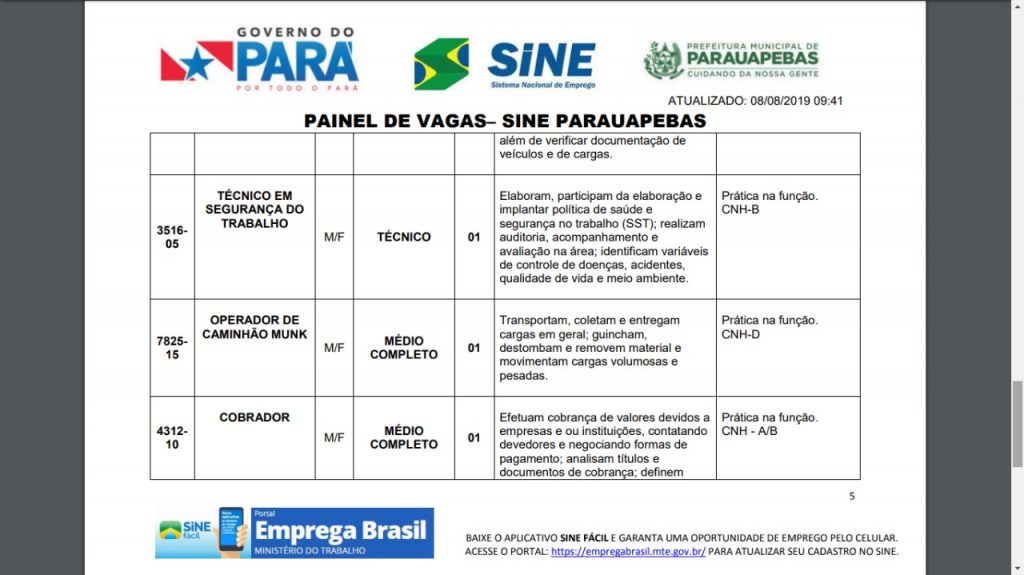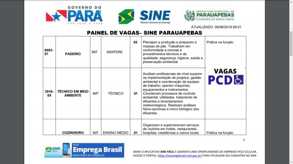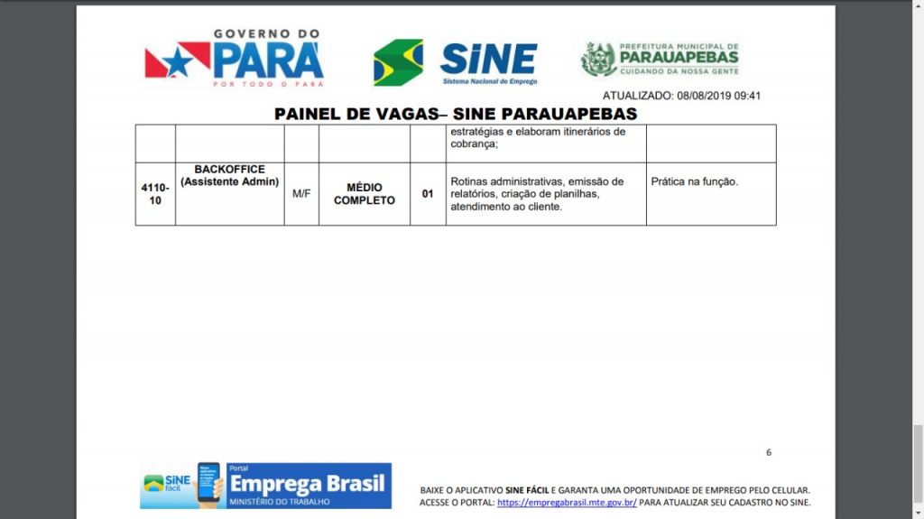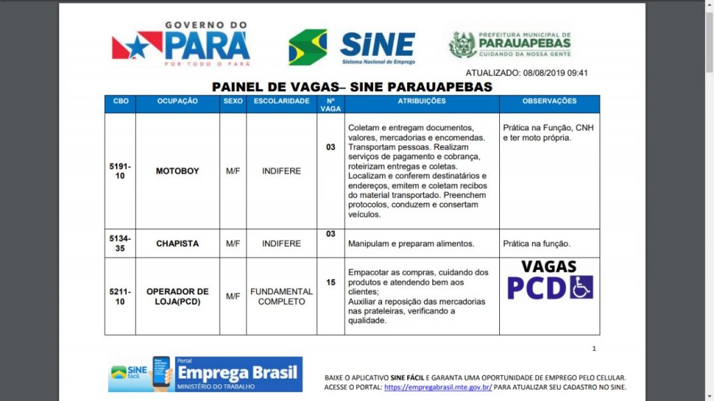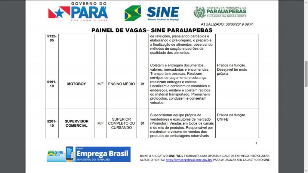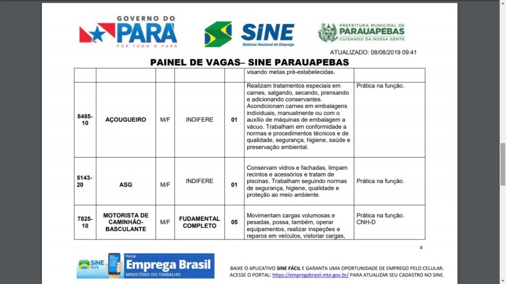 A Prefeitura de Parauapebas informa vagas de emprego para hoje, 08. O Sine fica na rua 11, entre as ruas E e D – Cidade Nova. O horário de atendimento é de 8h às 14h.