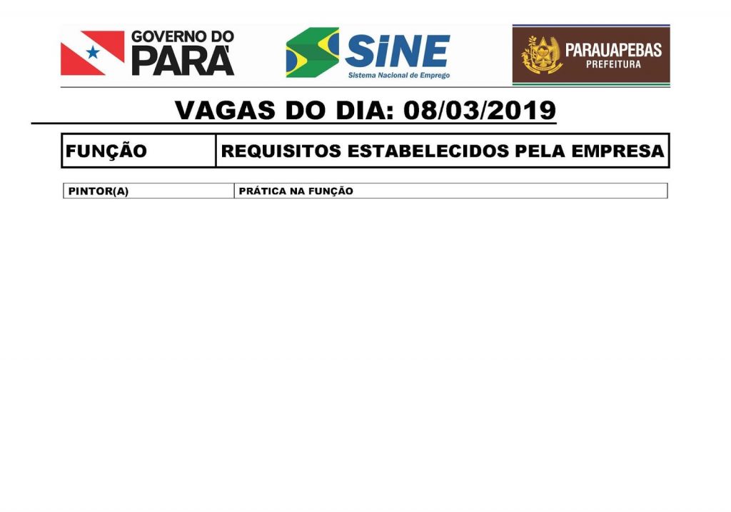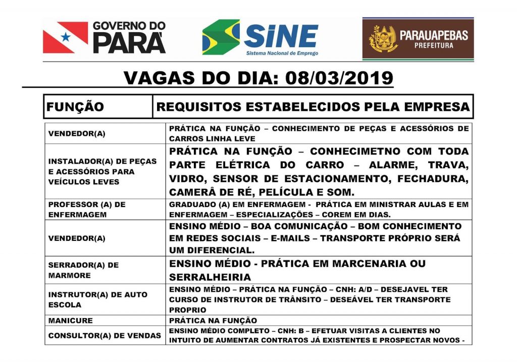 Sistema Nacional de Emprego (Sine), fica localizado no Bairro Cidade Nova, em Parauapebas. Confira as vagas disponibilizadas para esta sexta-feira (8):