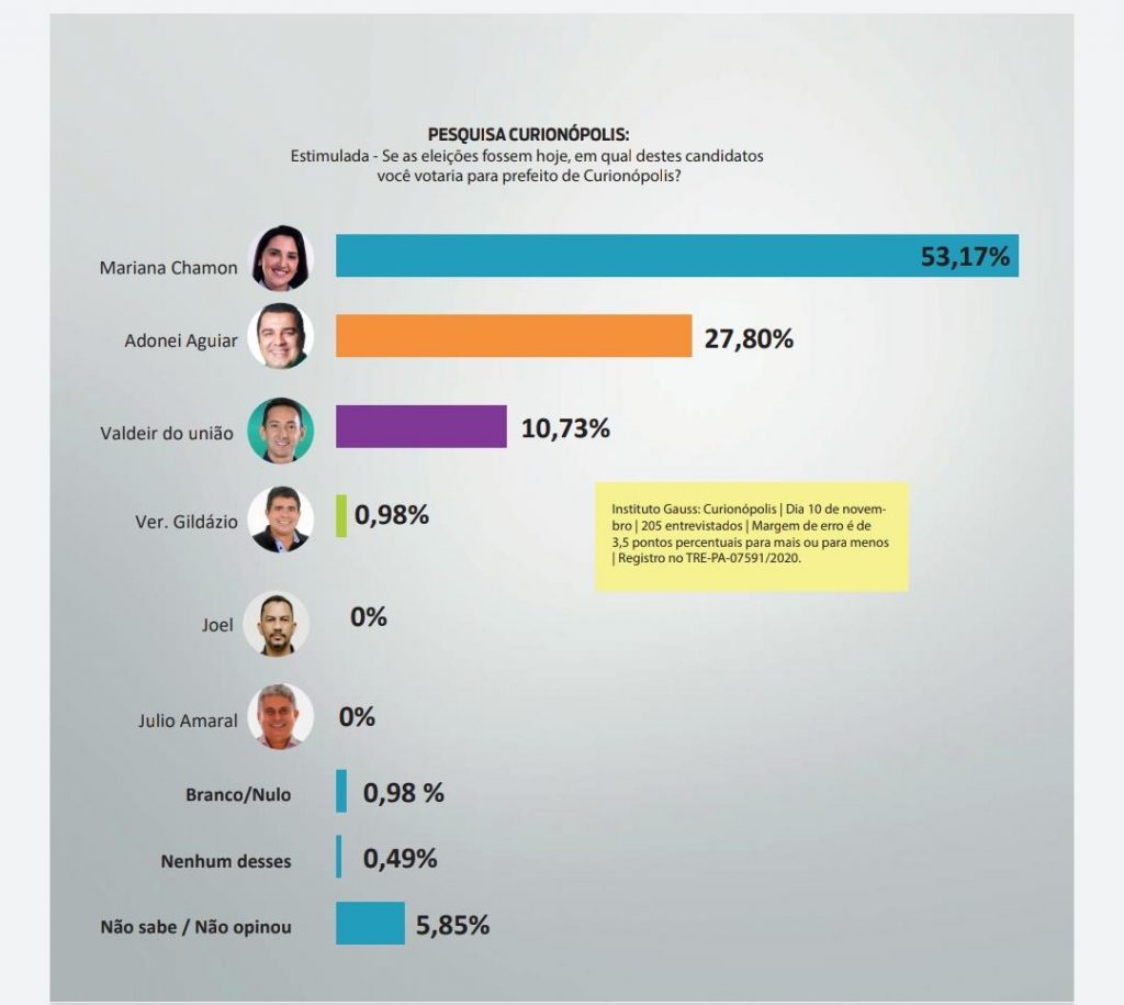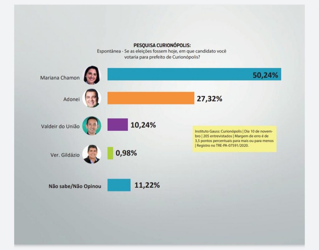 A pesquisa da Gauss foi contratada pelo Portal Pebinha de Açúcar e ouviu 205 eleitores de Curionópolis. Nesta nova pesquisa, a margem de erro é de 3,5 pontos para mais ou para menos e 95% de nível de confiança. Está registrada no TRE-PA-07591/2020.