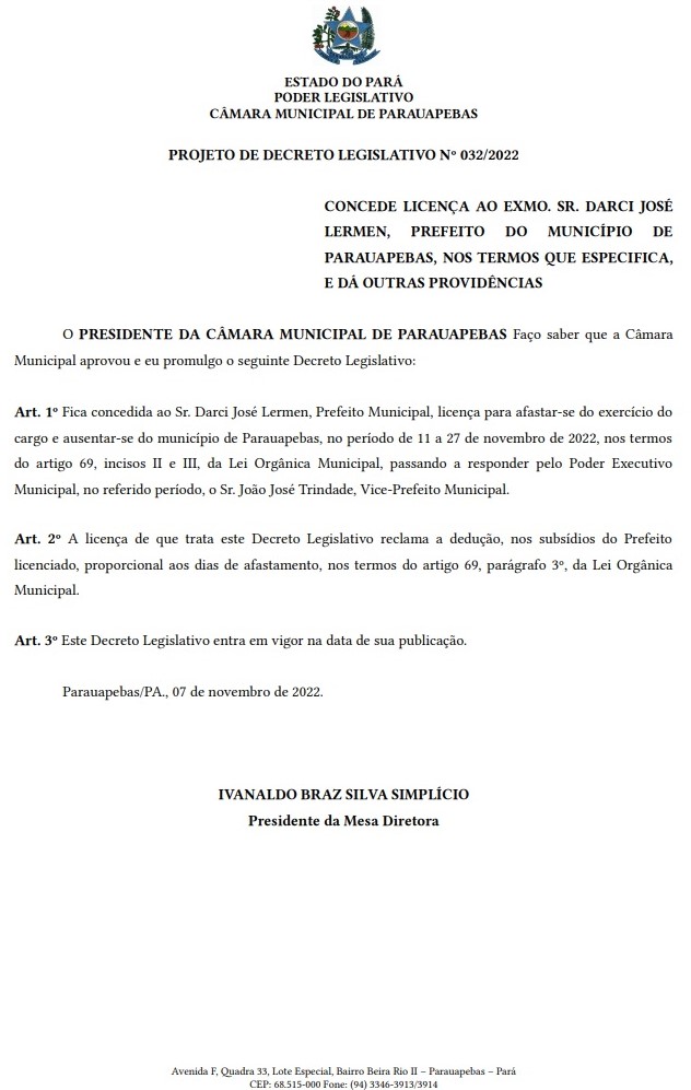 A partir do dia 11 de novembro, João José Trindade (PDT), conhecido como “João do Verdurão”, vice-prefeito de Parauapebas, deve passar a assumir oficialmente o comando da “Capital do Minério” por alguns dias. É que Darci José Lermen (MDB), protocolou na Câmara Municipal de Parauapebas um pedido de licença para afastar-se do cargo de prefeito e do município.
