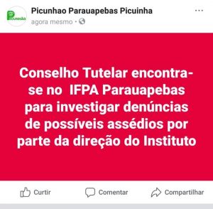 A ida dos conselheiros ao campus movimentou as redes sociais, quando a página Picunhão Parauapebas divulgou, no dia 4 de outubro, a informação sobre a conduta ilícita supostamente praticada pelo servidor público Rubens Rodrigues.