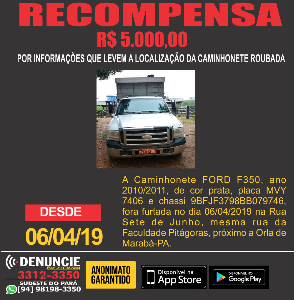 A Recompensa é de R$ 5 Mil Reais para quem der informações que levem a localização da Caminhonete FORD F350, ano 2010/2011, de cor prata, placa MVY 7406 e chassi 9BFJF3798BB079746 que fora furtada no dia 06/04/2019 na Rua Sete de Junho, mesma Rua da Faculdade Pitágoras, próximo a Orla de Marabá-PA.