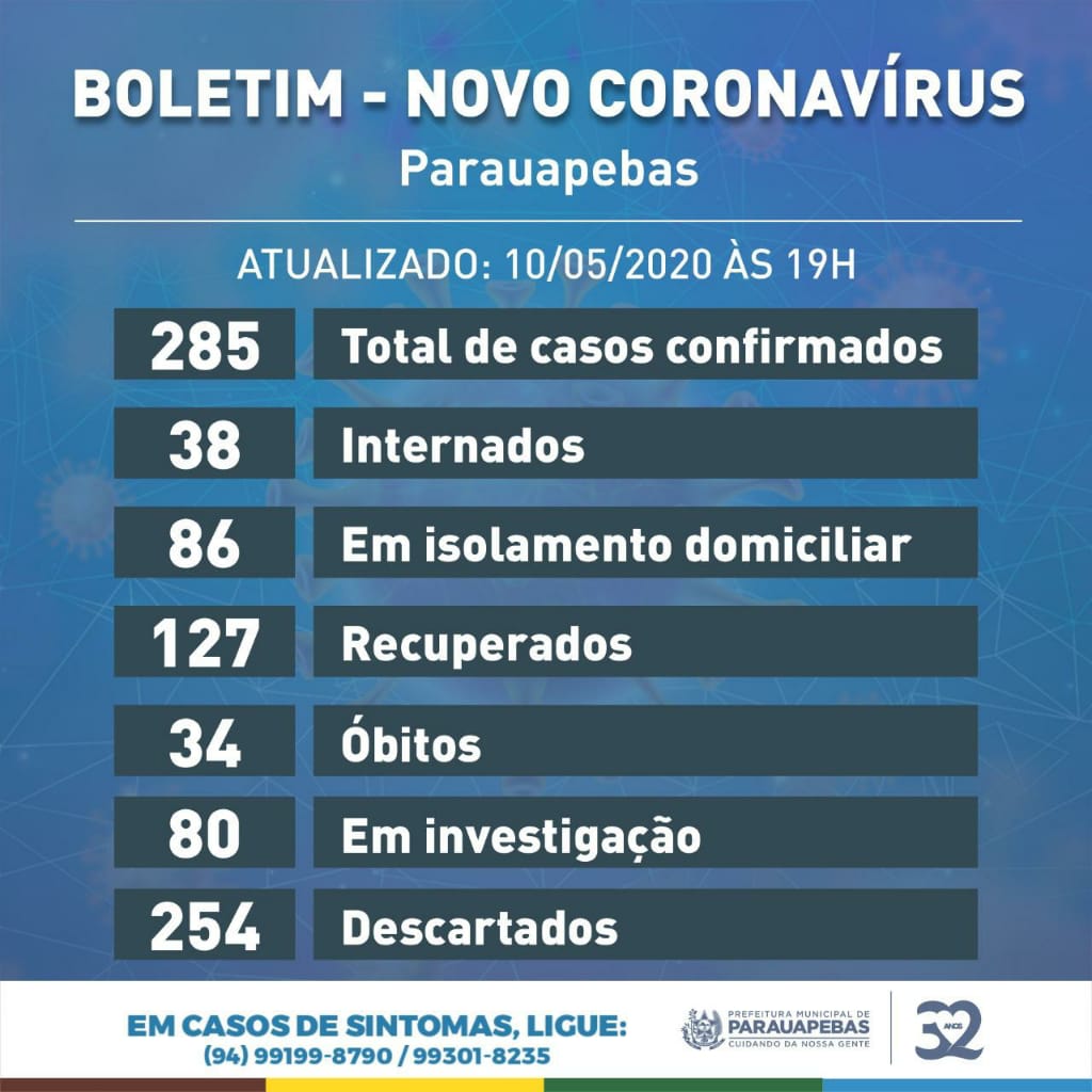 Neste domingo (10), aniversário de 32 anos de Parauapebas e Dia das Mães, felizmente não houve registro de novos casos de Covid-19, porém, infelizmente, mais um óbito ocorreu hoje decorrente da doença, trata-se de uma mulher de 38 anos que estava internada na UTI do Hospital Geral de Parauapebas (HGP). O teste positivo dela para a Covid-19 saiu dia 05/05.