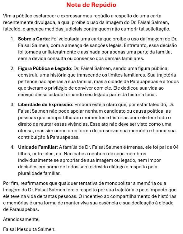 Faisal Mesquita Salmen, filho do ex-prefeito de Parauapebas, Dr. Faisal Faris Mahmoud Salmen Hussain, que infelizmente faleceu aos 68 anos de idade no dia 23 de julho de 2021, divulgou em suas redes sociais uma Nota de Repúdio sobre carta divulgada recentemente por familiares de seu pai, que proíbe a divulgação de imagens do político ainda em vida.