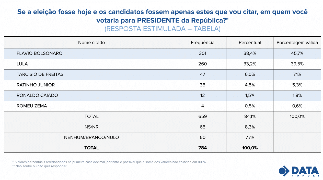 No recorte de votos válidos (quando são excluídos brancos, nulos e indecisos), o senador Flávio Bolsonaro (PL) aparece com 45,7% das intenções de voto, seguido pelo atual presidente Lula (PT), que soma 39,5%.