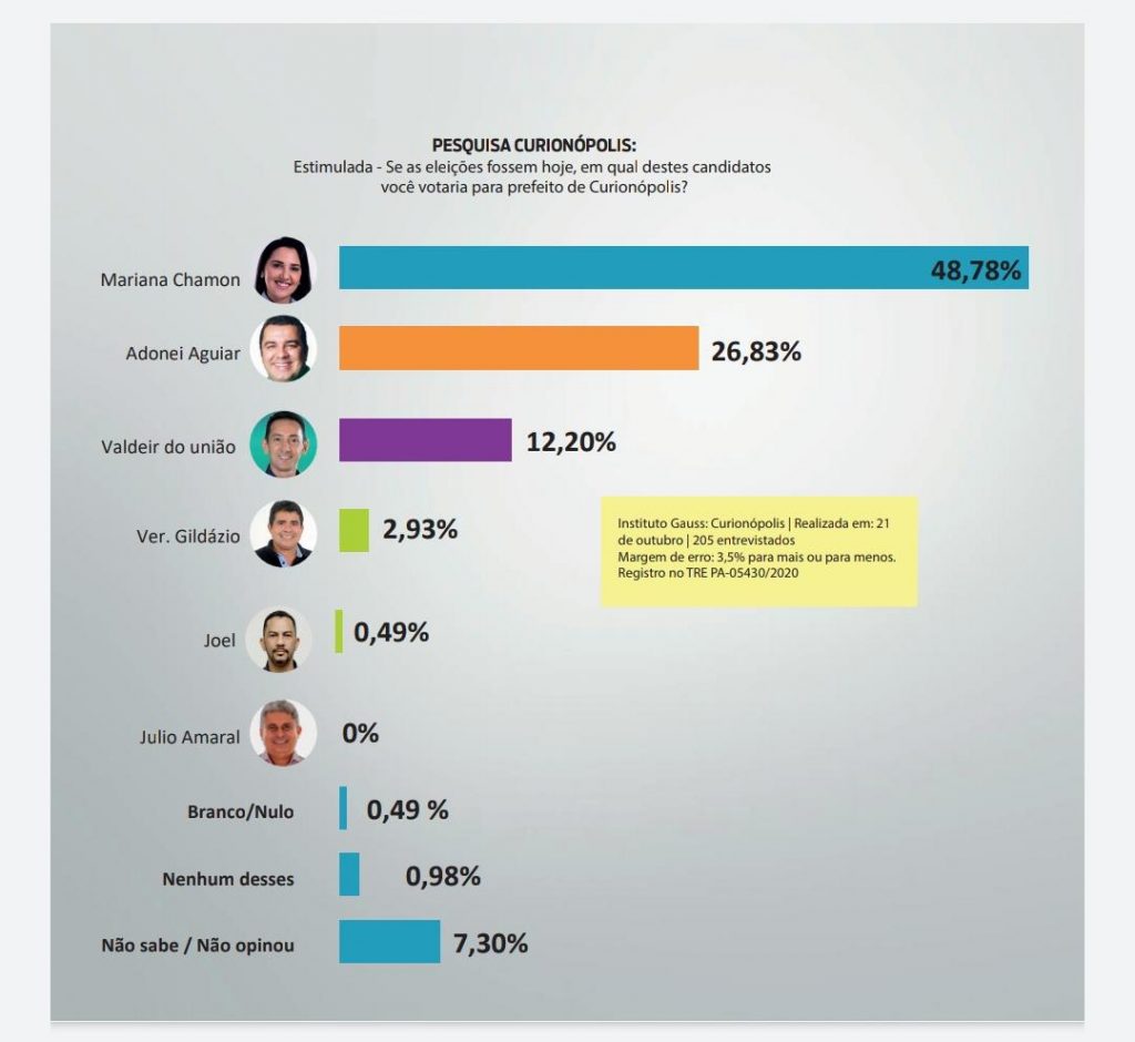A pesquisa da Gauss foi encomendada pelo Portal Pebinha de Açúcar e ouviu 205 eleitores de Curionópolis no dia 21 de outubro. Nesta nova pesquisa a margem de erro é de 3,5 pontos para mais ou para menos e 95% de nível de confiança. Está registrada no TRE-PA-05430/2020.