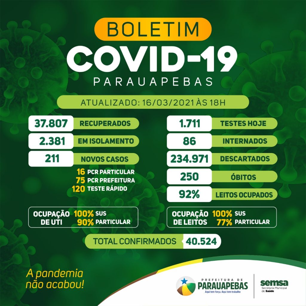 De acordo com dados da Semsa, Parauapebas chegou a 100% da ocupação dos leitos públicos de enfermaria e UTI. E as notícias ruins não param, tendo em vista que só hoje, foram registrados mais duas mortes e 211 novos casos de Covid-19.