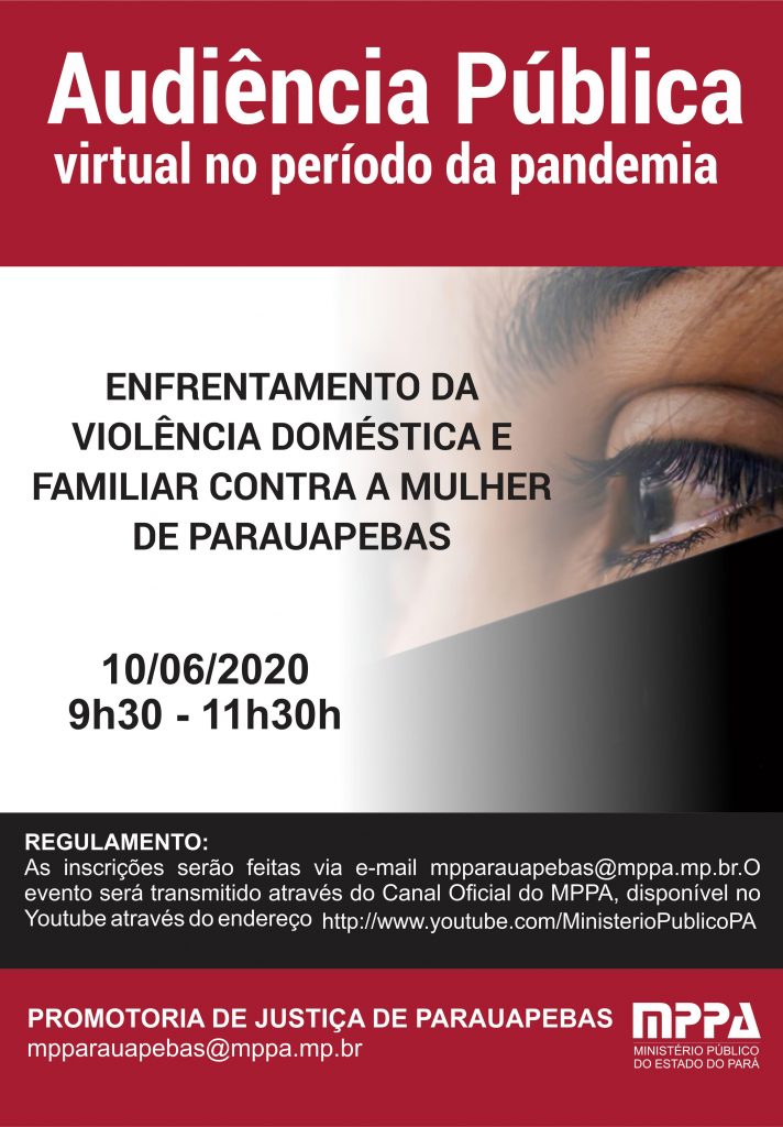 O Ministério Público do Estado do Pará, por meio da 1ª Promotoria de Justiça de Parauapebas, e de sua Promotora de Justiça Titular, no uso de suas atribuições legais, convoca a comunidade em geral, especialmente a rede de proteção e defesa da mulher para a “Audiência Pública Virtual de Enfrentamento da Violência Doméstica e Familiar contra a Mulher de Parauapebas, ante as medidas de isolamento social no período da Pandemia do novo Coronavírus”, no dia 10.06.2020, no horário das 09h30 às 11h30, pelo canal oficial do Ministério Público do Pará no YouTube.