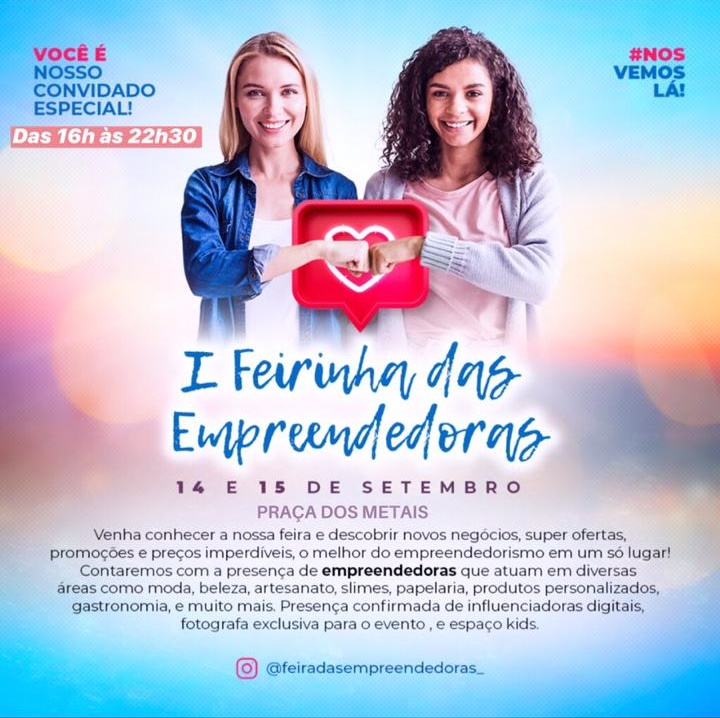 A “1ª Feirinha das Empreendedoras” acontecerá na Praça dos Metais, no Bairro Cidade Nova, nos dias 14 e 15, a partir das 16h00.