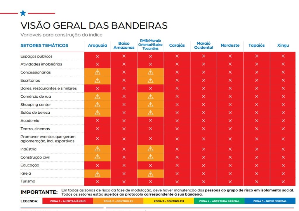 O plano foi baseado nas zonas de risco de cada região do Pará: Araguaia, Baixo Amazonas, Região Metropolitana de Belém, Marajó Oriental, Baixo Tocantins, Carajás, Marajó Ocidental, Nordeste, Tapajós e Xingu. Foram definidas cinco zonas por nível de risco em ordem decrescente de gravidade. As ações de isolamento e de retomada serão moduladas para assegurar o atendimento à população e a garantia de controle da contaminação, a partir desta classificação.