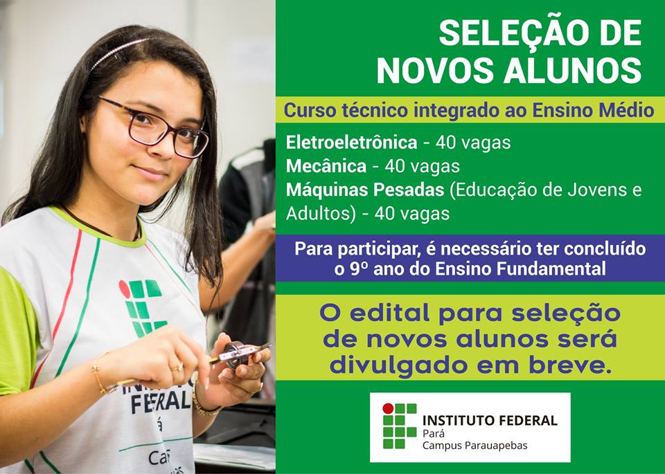 O Instituto Federal do Pará (IFPA) Campus Parauapebas, divulgará nos próximos dias o início do processo seletivo para o ano de 2019. Trata-se do edital para a seleção de novos (as) alunos (as) para os cursos técnicos integrados ao Ensino Médio.