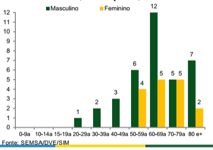 O número de óbitos por esta causa aumenta com a idade, sendo que em todas as faixas etárias, o sexo masculino predomina, com exceção da faixa de 70 a 79 anos, na qual há igualdade de óbitos com as mulheres.