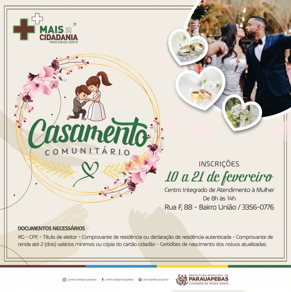 A partir desta segunda-feira (10) iniciaram as inscrições para mais uma edição do Casamento Comunitário, ação realizada pela Prefeitura de Parauapebas, por meio da Secretaria Municipal da Mulher (Semmu). Os interessados devem procurar o Centro Integrado de Atenção à Mulher, localizado na Rua F, nº 88, Bairro Cidade Nova.