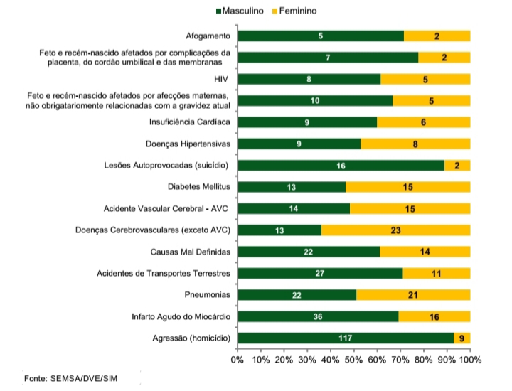 Em 2018, as principais causas específicas de óbito distribuíram-se de maneira diferenciada de acordo com o sexo. Mais de 90% das mortes por homicídios, mais de 80% dos suicídios e mais de 70% das mortes por afogamento e por acidentes com transportes terrestres ocorreram nos homens. Nas mulheres, as causas mais expressivas foram as doenças cerebrovasculares (exceto AVC) com 23 óbitos, diabetes mellitus com 15 óbitos e acidente vascular cerebral (AVC) também com 20 óbitos, representando respectivamente, 63,89%, 53,57% e 51,72% de todos os óbitos ocorridos por estas causas.