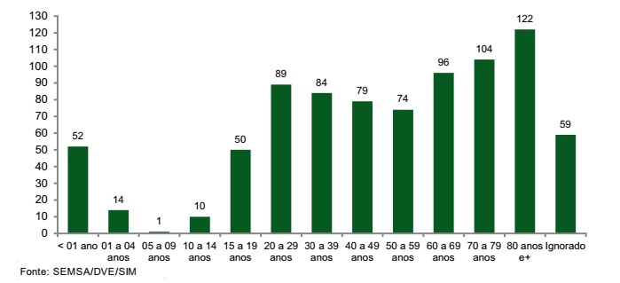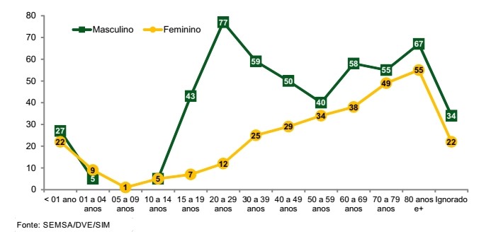 Em 2018, a mortalidade por faixa etária apresentou perfil diferente para cada sexo: no masculino, a mortalidade foi mais precoce, aumentando significativamente na faixa de 20 a 29 anos; já no sexo feminino, a mortalidade segue um aumento gradativo conforme a idade, sendo a maior concentração dos óbitos em mulheres acima de 80 anos de idade.