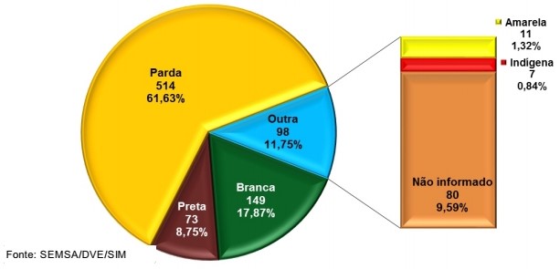Pessoas pardas morrem mais jovem em Parauapebas – A morte não tem preferência por raça, sendo todos por ela nivelados. Claro que com a presença expressiva de pessoas “pardas” é natural que a predominância no número de óbitos sejam sempre nelas. Talvez, por isso, do total de óbitos ocorridos em 2018, 514 (61,63%) eram indivíduos pardos, 149 (17,87%) brancos, 73 (8,75%) pretos, 11 (1,32%) amarelos e 7 (0,84%) indígenas. Os óbitos sem informação na raça/cor corresponderam a 80, o que representa 9,59%.