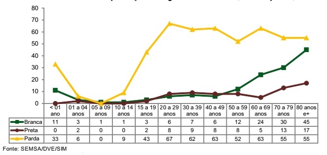 A mortalidade por idade foi semelhante entre brancos e pretos e diferente quando comparada com pardos. Enquanto nos pretos e brancos ocorre uma tendência de crescimento ao longo da idade com mais da metade (66,44%) dos óbitos em brancos e quase a metade (47,95%) em indivíduos pretos registrados nas faixas acima de 60 anos de idade, nos pardos a concentração dos óbitos ocorre nas faixas etárias mais jovens e diminui a partir dos 70 anos de idade. Esta diferença revela uma mortalidade mais precoce no grupo de raça/cor parda.