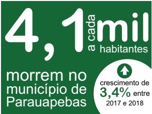 A principal causa de mortes em Parauapebas foi agressão – A principal causa específica de mortalidade em Parauapebas no ano de 2018 foi agressão (homicídio), responsável por 127 óbitos com taxa de aproximadamente 63 mortes para 100 mil habitantes (15,23% de todas as mortes). Comparando-se com 2017, houve um aumento de 32 mortes por homicídio, o que representa 33,68% a mais no risco de morte por esta causa no município. Em segundo lugar aparece o infarto agudo do miocárdio, com 52 óbitos (6,24%) e taxa de 25,63 óbitos/100 mil habitantes, apresentando uma pequena redução de 7,14% em relação ao ano anterior. Em seguida, vêm as pneumonias com 43 óbitos (5,16%) e os acidentes de transportes terrestres com 38 óbitos (4,56%). Chama atenção a elevação no índice de mortes por causas mal definidas e suicídio, em 184,62%, e 125%, respectivamente.