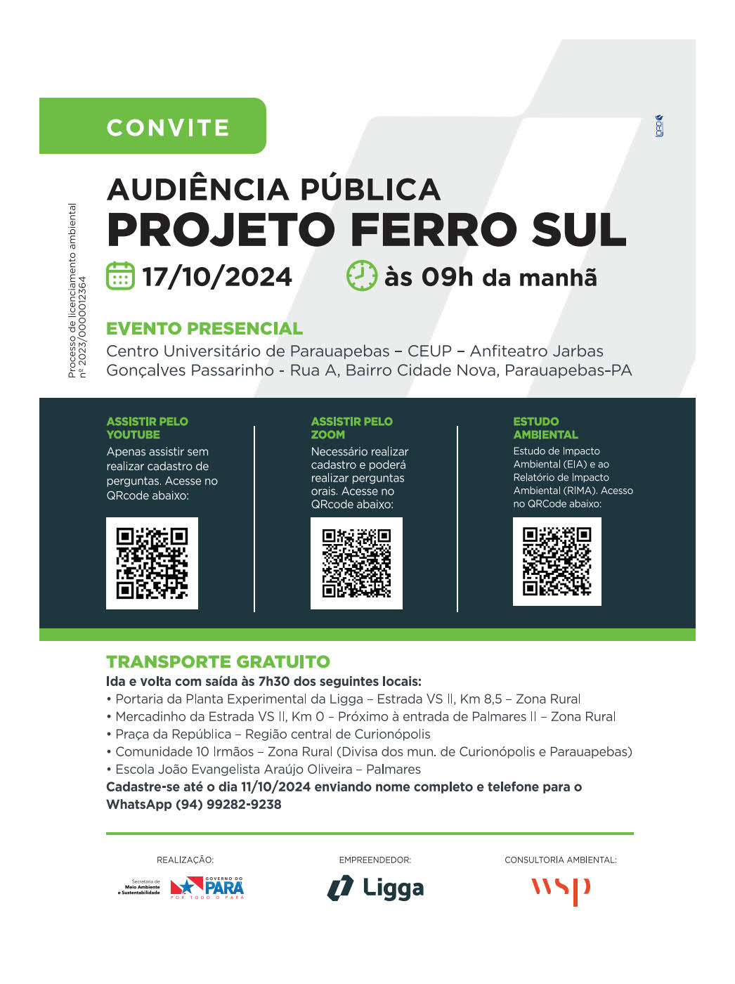 A Ligga S/A, empresa responsável pelo empreendimento ´Ferro Sul`, informa que a Secretária de Estado de Meio Ambiente e Sustentabilidade (SEMAS/PA), no uso de suas atribuições legais, e considerando o disposto nos artigos 253 e 255, da Constituição Estadual e nos artigos 103 e 109 da Lei Estadual nº 5.887, de 9 de maio de 1995, que dispõe sobre a participação popular nas decisões ambientais, convoca os Ministérios Públicos Federal e Estadual, as autoridades federais, estaduais e municipais, os órgãos públicos e privados, instituições governamentais e não governamentais e a população em geral para participarem da audiência pública, objetivando: Informar à comunidade sobre o Projeto Ferro Sul, de responsabilidade da empresa LIGGA S.A, referente à extração mineral e ao beneficiamento de minério de ferro, a ser localizado nos municípios de Parauapebas e Curionópolis, estado do Pará e seus potenciais impactos ambientais, visando possibilitar a discussão e o debate sobre o Estudo e Relatório de Impacto Ambiental (EIA/RIMA), no intuito de subsidiar a análise do processo pela Secretaria de Estado de Meio Ambiente e Sustentabilidade (SEMAS), para fins de licenciamento prévio, evento a ser realizado no dia, horário e local, abaixo discriminados: