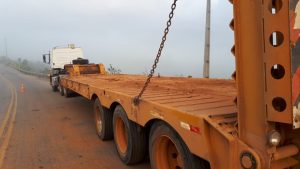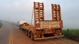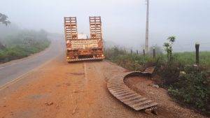 Durante as primeiras horas da manhã desta segunda-feira (8), o motorista de um caminhão que transportava uma máquina de grande porte acabou levando um susto danado ao presenciar que o equipamento acabou se desprendendo da carreta e caiu.