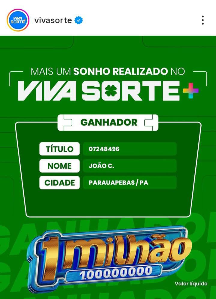 “João, de Parauapebas (PA), tá milionário! 💸 Levou R$1 MILHÃO com o Viva Sorte+! 🍀 Mais um sonho realizado e uma vida transformada! 🚀”