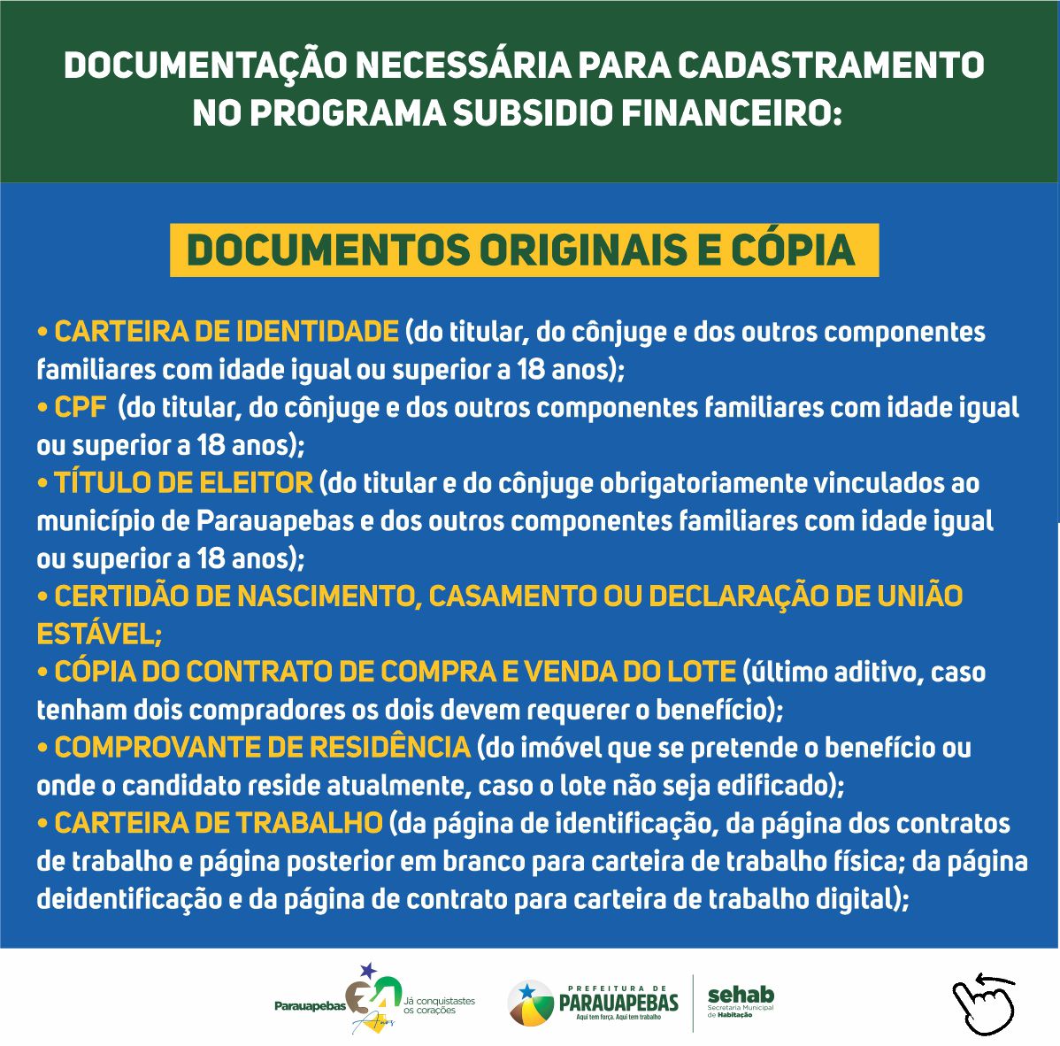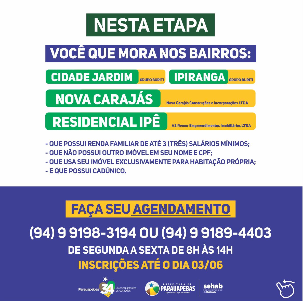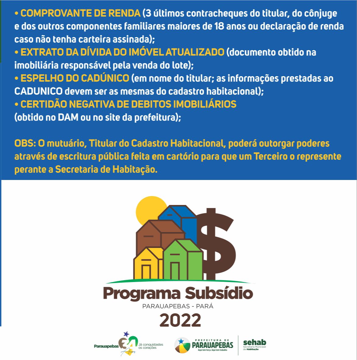 A Prefeitura de Parauapebas, por meio da Secretaria Municipal de Habitação, informa que estão abertas as inscrições para o Programa Subsídio 2022, inicialmente para moradores dos Bairros Cidade Jardim, Ipiranga, Nova Carajás e Residencial Ipê.