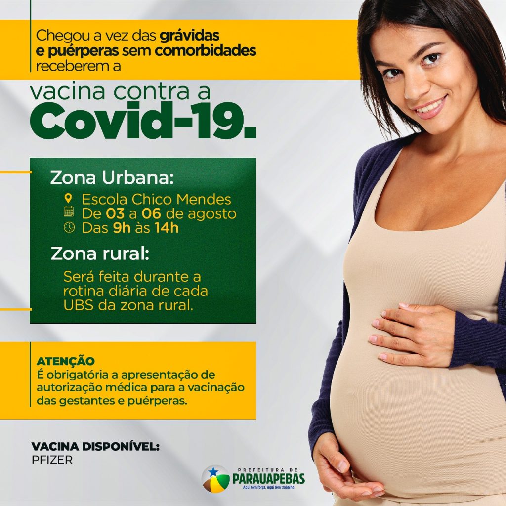 As grávidas e puérperas a partir de 18 anos podem ser vacinadas contra Covid-19 a partir desta terça-feira, 03. A Secretaria Municipal de Saúde (Semsa), já realizou a vacinação das grávidas e puérperas (mulheres de pós-parto de até 45 dias) com comorbidades e agora expande a imunização também para aquelas que não têm comorbidades.