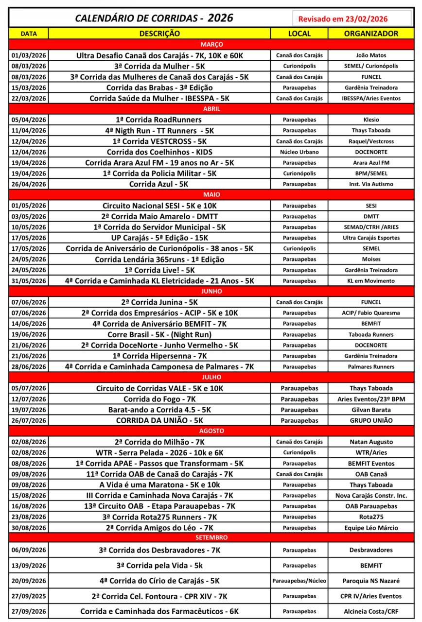 Parauapebas definitivamente entrou para o mapa das grandes cidades da corrida de rua no Norte do Brasil. Um levantamento ao qual a equipe do Portal Pebinha de Açúcar teve acesso revela um calendário intenso de provas ao longo de 2026, com eventos praticamente todos os meses e, em alguns períodos, mais de uma corrida no mesmo fim de semana.
