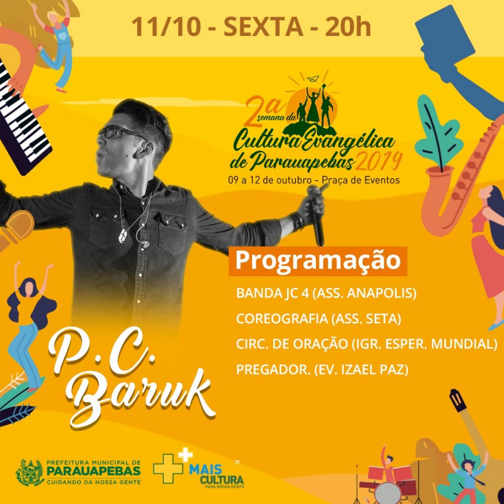 Dando prosseguimento na programação da II Semana da Cultura Evangélica de Parauapebas, evento organizado pela Secretaria Municipal de Cultura (Secult) e que está sendo realizado na Praça de Eventos, no Bairro Cidade Nova, quem se apresenta hoje (11) é o cantor nacional Paulo César Baruk.