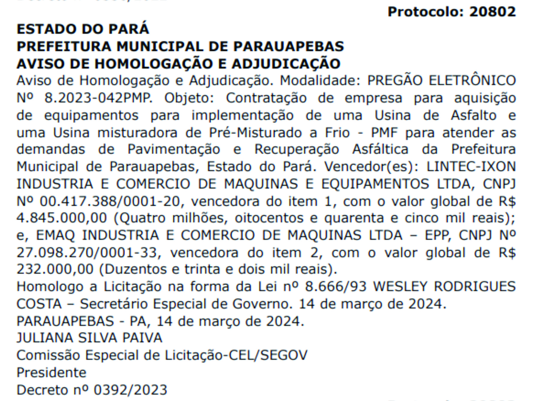 Em publicação feita no Diário Oficial do Município no dia 19 de março de 2024, a Prefeitura Municipal de Parauapebas (PMP), através da Secretaria Especial de Governo (Segov), que tem como titular da pasta Wesley Rodrigues Costa, fez a homologação e adjudicação que tem como objeto a contratação de empresas para aquisição de equipamentos para implementação de uma usina de asfalto e uma misturadora de pré-misturado a frio.