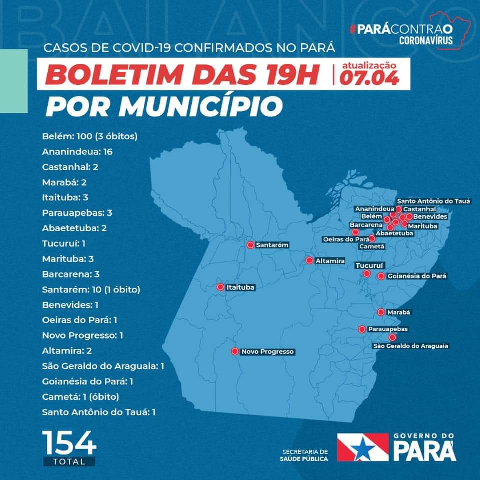 A Prefeitura de Parauapebas comunica que o município teve o 3º caso confirmado de Covid-19. É uma mulher de 62 anos, com Doença Pulmonar Obstrutiva Crônica (DPOC), diabética e hipertensa. Ela viajou para municípios vizinhos de Marabá antes de apresentar os sintomas, que começaram dia 26 de março.