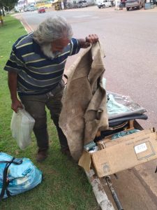 Assim, a população de Parauapebas já se acostumou a ver pela rua o piauiense Raimundo Nonato de Oliveira Neto, que, segundo a Secretaria de Assistência Social (Semas), “não é andarilho e sim pessoa em situação de rua”. Ele me disse que há 20 anos circula pelo Pará, mas em Parauapebas já está há uns quatro anos. “Estive aqui outras três vezes”, explicou.