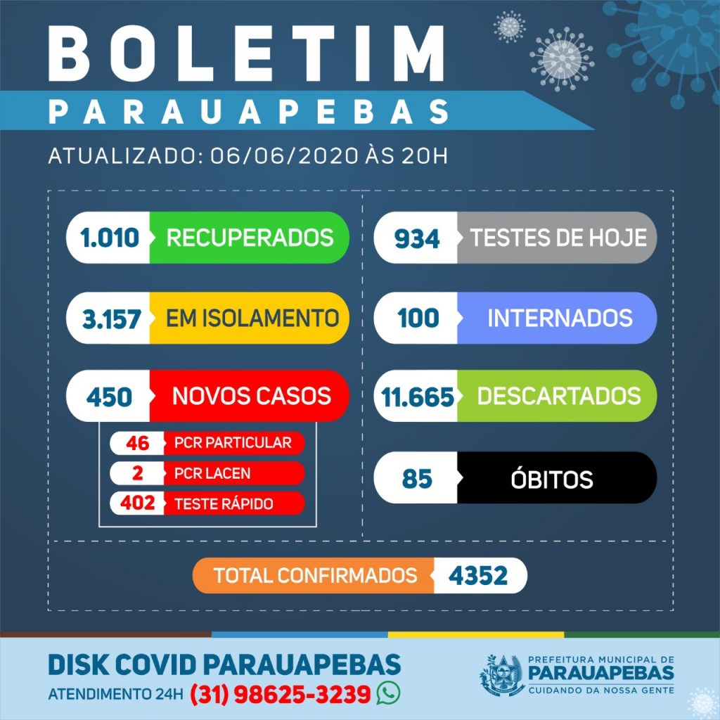 Parauapebas segue firme na luta contra o coronavírus. Temos 1.010 pessoas já recuperadas da Covid-19. Entretanto, neste sábado, 6, o município registrou 450 novos casos, confirmados por meio de testes rápidos, exames PCR realizados pelo Laboratório Central (Lacen) e laboratórios particulares. Infelizmente, tivemos 4 óbitos.